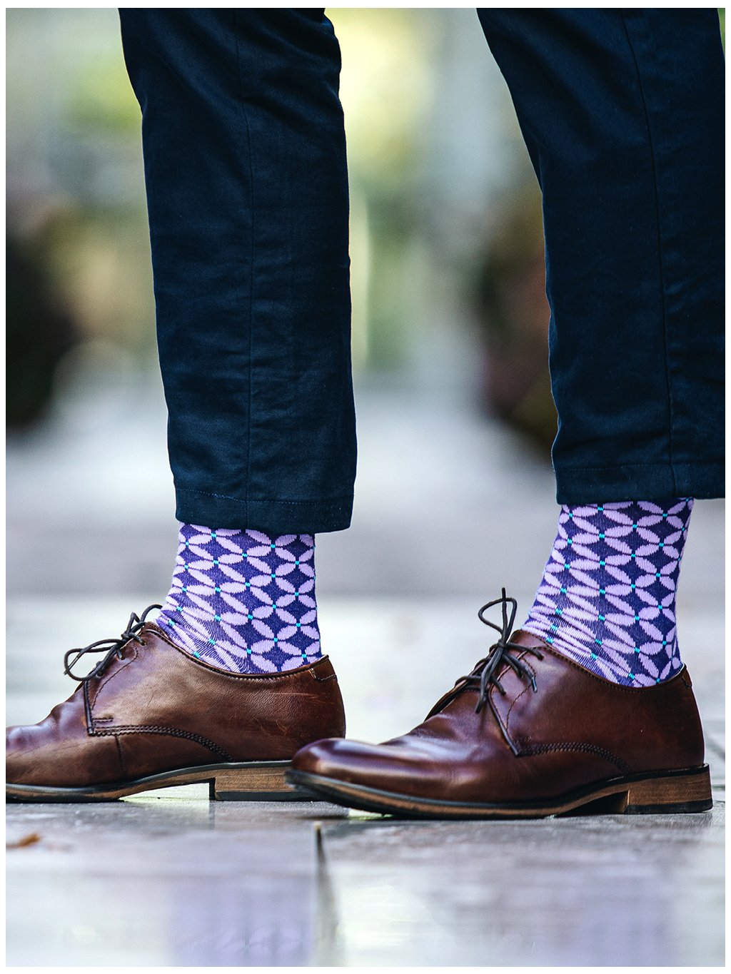 Tyhle fialové ponožky jsou jako dělané pro gentlemana, který se ve světě byznysu prostě neztratí a drží krok s dobou. Dávej ale pozor, ať se ti neztratí doma – slyšeli jsme totiž, že se díky své výrazné barvě zalíbily i dámám.